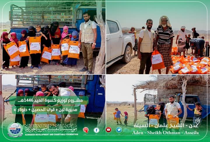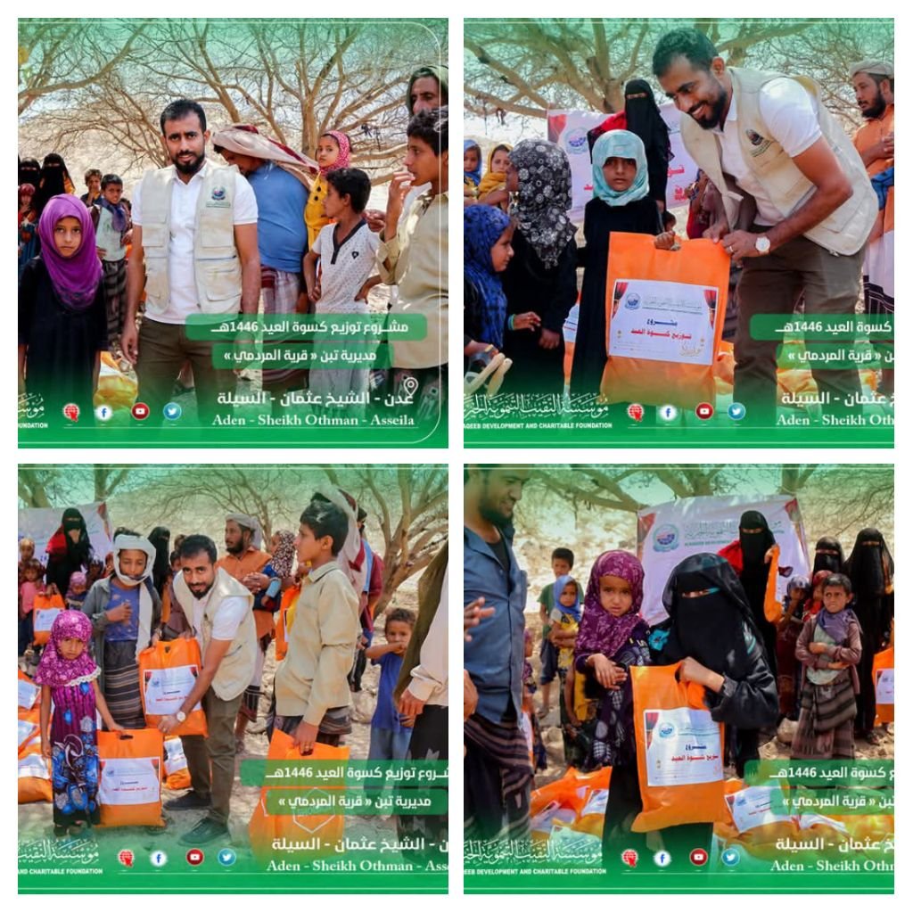 مؤسسة النقيب التنموية الخيرية تستمر في إسعاد الأطفال بمشروع كسوة العيد في مناطق الحصين، طواع، هيفان بمحافظة لحج.