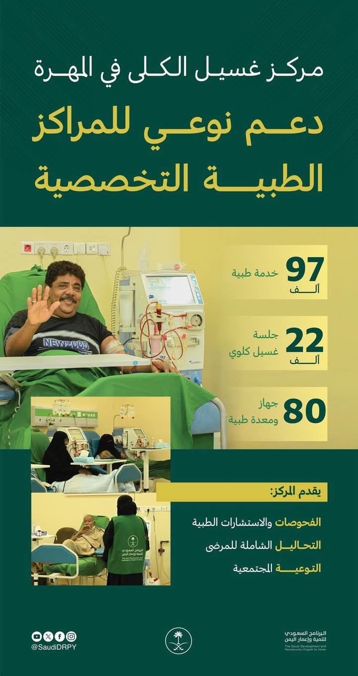 البرنامج السعودي لتنمية وإعمار اليمن يقوم بإنشاء مركز غسيل الكلى في المهرة.