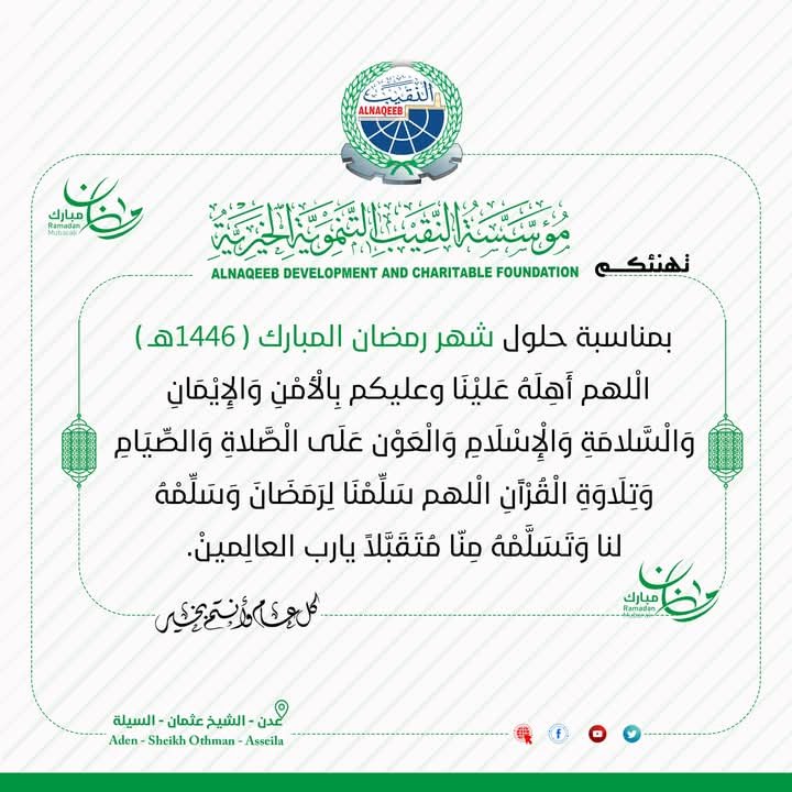 مؤسسة النقيب التنموية الخيرية ... تقدم احر التهاني والتبريكات بمناسبة حلول شهر رمضان المبارك.