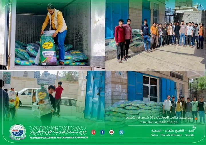 مؤسسة النقيب التنموية الخيرية تدعم سكن طلاب المفلحي بـ 30 كيس أرز التيسير لمواصلة العملية التعليمية.