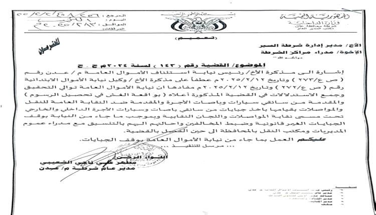 وبناء على مذكرة مدير امن عدن على جميع الشرط ايقاف هذة الجبايات النقابية وضبط المخالفين واحالتهم للنيابة .
