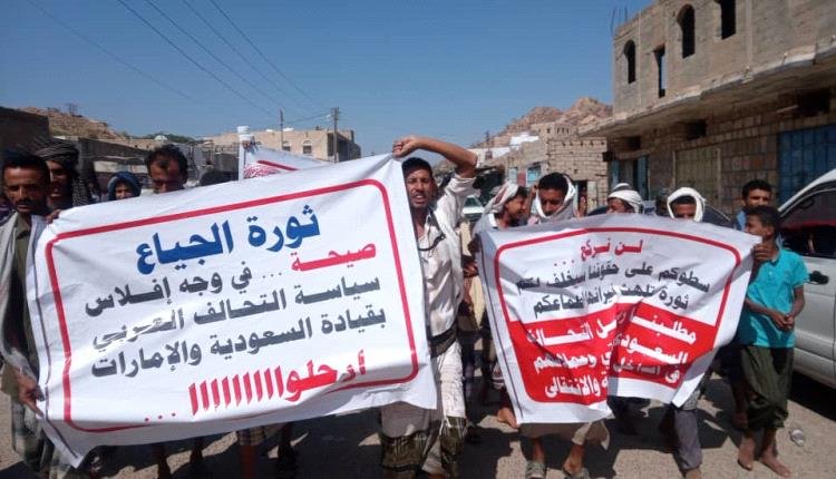 وحملوا الشرعية والانتقالي والتحالف السعودي والإماراتي و الأطراف المعنية مسؤولية استمرار الأزمة الإنسانية وتدهور الوضع الاقتصادي في البلاد وتأتي هذه المسيرات في سياق تصاعد الغضب الشعبي في محافظة أبين و مختلف المناطق المحررة اليمن جراء الأوضاع المعيشية الصعبة التي يعاني منها المواطنون.