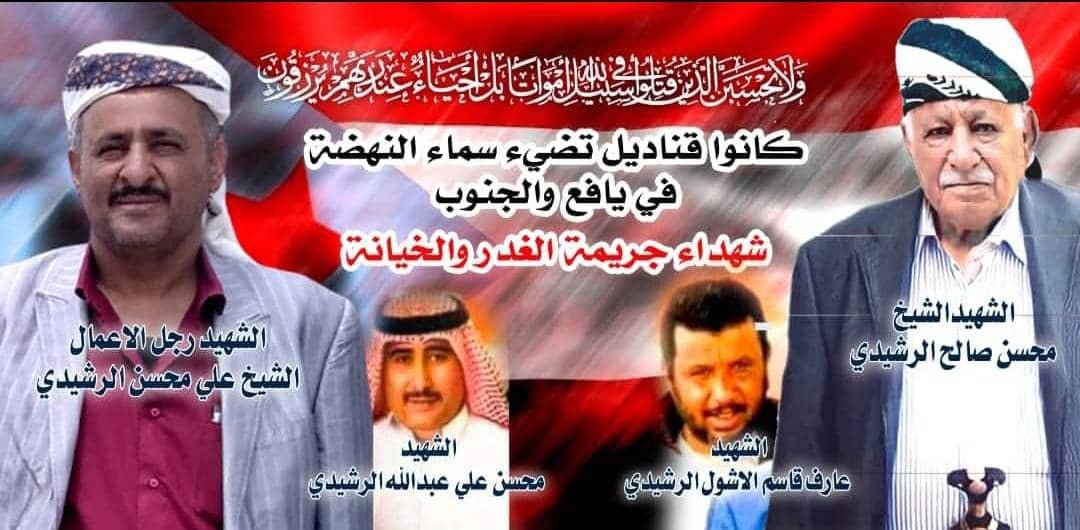 يشار إلى إن الشهداء المغدورين بهم محسن صالح الرشيدي ونجله علي محسن كانو يقدمون بأنفسهم كل عام مع إقتراب موعد شهر رمضان المبارك إلى مديرية المسيمير لزيارة وتفقد الاسر الفقيره وتوزيع الصدقات للفقراء والمحتاجين با بأنفسهم .رحمة الله تغشاهم واسكنهم فسيح جناته.. ولا نامت أعين الغدر والاجرام والخيانه