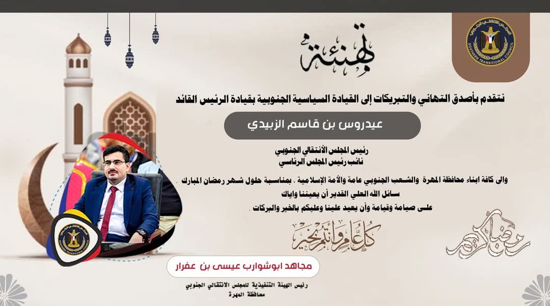 بعث رئيس الهيئة التنفيذية للقيادة المحلية للمجلس الانتقالي الجنوبي بمحافظة المهرة، مجاهد بن عفرار، برقية تهنئة إلى القيادة السياسية ممثلة بالرئيس القائد عيدروس الزُبيدي ، وإلى كافة أبناء شعب الجنوب، بمناسبة حلول شهر رمضان المبارك .