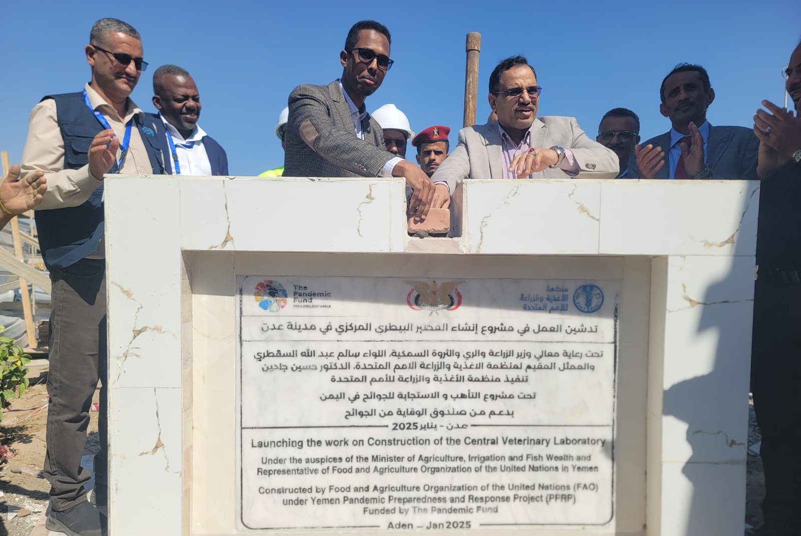كما دشن الوزير سالم السقطري مشروع بناء المختبر البيطري المركزي الذي سيتم تنفيده بالمجمع الزراعي عدن وخلال التدشين الذي جاء تحت رعاية الوزير سالم السقطري والممثل المقيم لمنظمة “الفاو” في اليمن الدكتور حسين جادين ووزير الدولة محافظ العاصمة عدن الأستاذ أحمد لملس قام الوزير السقطري والدكتور علي جالول مدير مكتب “الفاو” بعدن بوضع حجر الأساس إيذاناً ببدء العمل في المشروع الذي تشرف على تنفيذه منظمة “الفاو” على مساحة ٢٥٤٠ متر مربع وذلك ظمن مشروع التأهب والاستجابة للجوائح في اليمن الممول من صندوق الوساطة المالية للامن الصحي(صندوق الجائحة) ومن المتوقع الانتهاء منه نهاية العام الجاري و يتكون من طابقين فيها اقسام التشخيص المختبري لأمراض الثروة الحيوانية وفحص المنتجات الحيوانية والترصد الوبائي المختبري و٣ صالات ومكاتب ادارية.