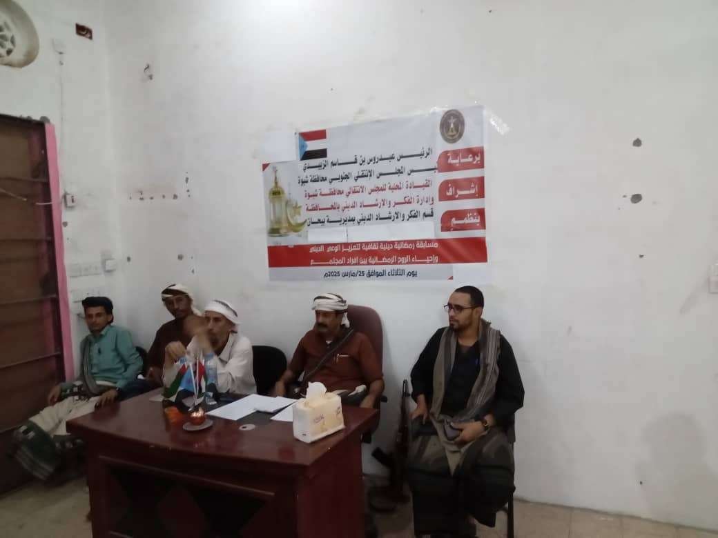 نظم قسم الفكر والإرشاد في الهيئة التنفيذية للقيادة المحلية للمجلس الانتقالي الجنوبي في مديرية بيحان بمحافظة شبوة، اليوم الأربعاء، مسابقة رمضانية دينية وثقافية، وذلك ضمن البرامج والأنشطة التي تنفذها القيادة المحلية بالمديرية خلال الشهر الفضيل.