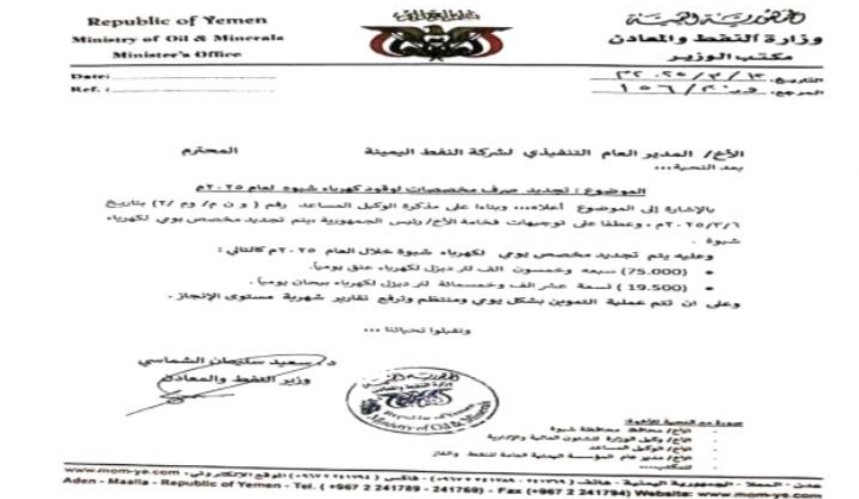 وأضاف أن هذه التوجيهات جاءت عقب زيارة الوزير لمحافظة شبوة ، وتم توجيهها رسمياً إلى مدير عام فرع شركة النفط اليمنية بمحافظة مأرب ، إلا أن الجهات المعنية هناك لم تلتزم بتنفيذها حتى الآن ..