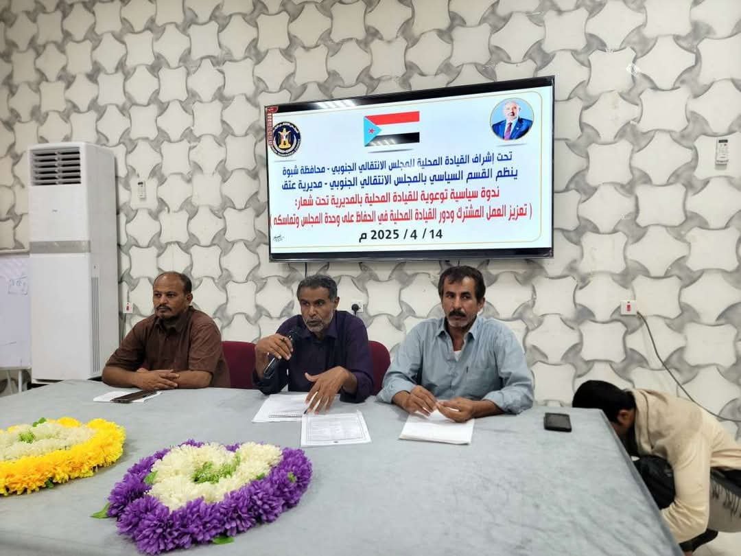 نظّم القسم السياسي في الهيئة التنفيذية للقيادة المحلية للمجلس الانتقالي الجنوبي بمديرية عتق، محافظة شبوة، اليوم الاثنين، ندوة سياسية توعوية لأعضاء القيادة المحلية، تحت شعار: "تعزيز العمل المشترك ودور القيادة المحلية في الحفاظ على وحدة المجلس وتماسكه."