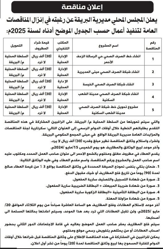 وأشار الإعلان إلى أن آخر موعد لبيع الوثائق والمظاريف هو يوم الأربعاء الموافق 7 مايو 2025م، على أن يكون رسم المناقصة الواحدة 50 ألف ريال، بالإضافة إلى ضمان بنكي بنسبة 3% من قيمة العطاء المقدم.
