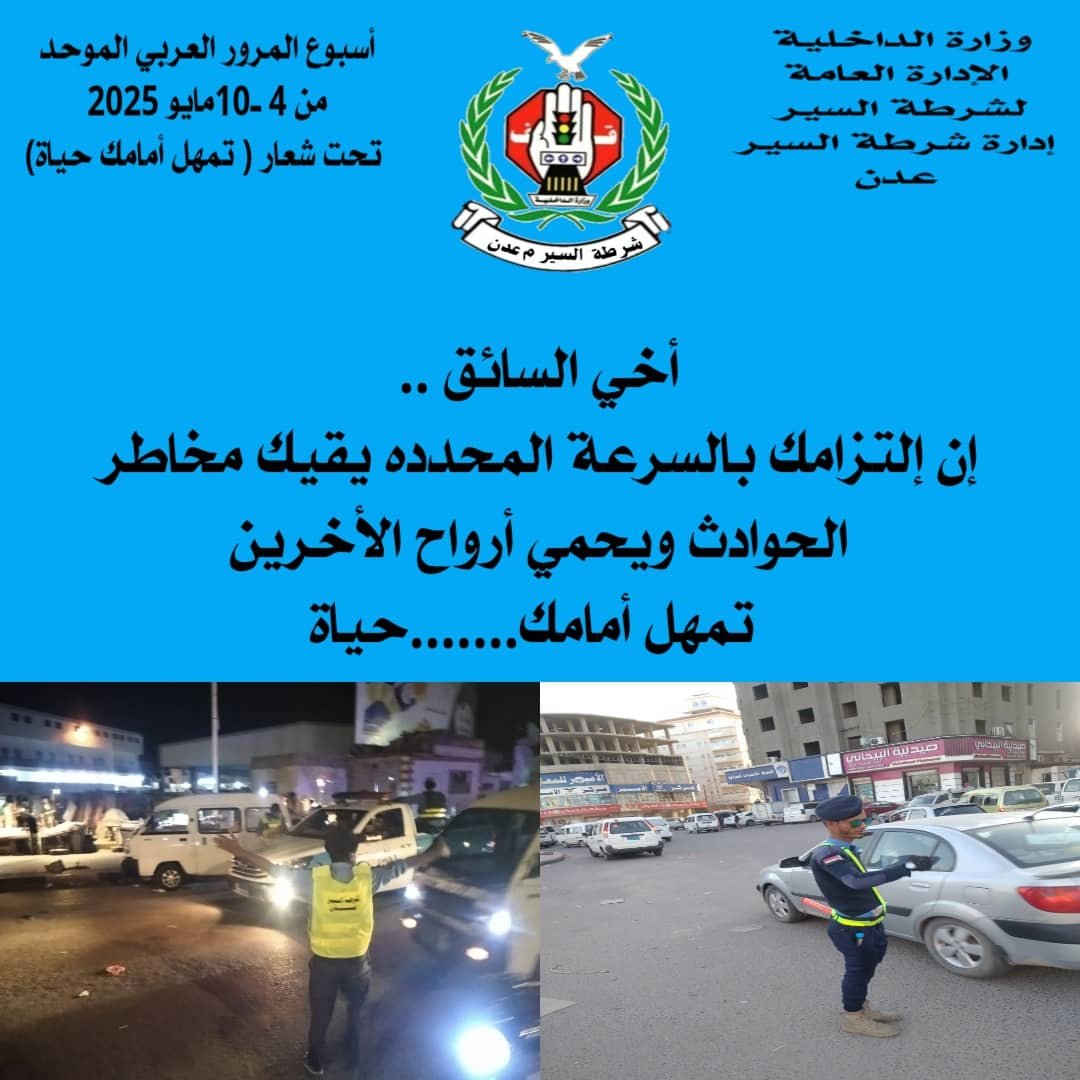 تواصل إدارة شرطة السير في العاصمة عدن، لليوم الرابع على التوالي، تنفيذ فعاليات أسبوع المرور العربي الموحد لهذا العام، تحت شعار: "تمهّل.. أمامك حياة"، عبر برنامج توعوي وإرشادي شامل يهدف إلى تعزيز السلامة المرورية والحد من الحوادث. وانتشر رجال شرطة السير وشرطة المرور النسائية وأنصار المرور في مختلف شوارع مديريات العاصمة، لتسهيل حركة السير وفض الاختناقات المرورية، بالتزامن مع توزيع منشورات وبوسترات توعوية على المواطنين. وأكدت الإدارة أهمية التزام السائقين بقواعد وآداب الطريق، وعدم تجاوز السرعة المحددة التي قد تتسبب في حوادث مميتة وخسائر بشرية ومادية، داعية إلى احترام رجل المرور وتجنب المخالفات حفاظاً على السلامة العامة. ودعا العميد عدنان القلعة، مدير عام شرطة السير بعدن، المواطنين إلى تجنّب قيادة المركبات دون رخصة، ومنع الأطفال والقُصر من القيادة، مشدداً على ضرورة التمهّل أثناء القيادة للحفاظ على الأرواح والممتلكات. وأوضح القلعة أن أسبوع المرور يمثل مناسبة توعوية هادفة لتعزيز الشراكة بين المجتمع وشرطة السير، لنشر ثقافة مرورية تضمن بيئة آمنة للجميع، مناشداً الآباء بتحمل مسؤولياتهم تجاه سلامة أبنائهم والمارة.