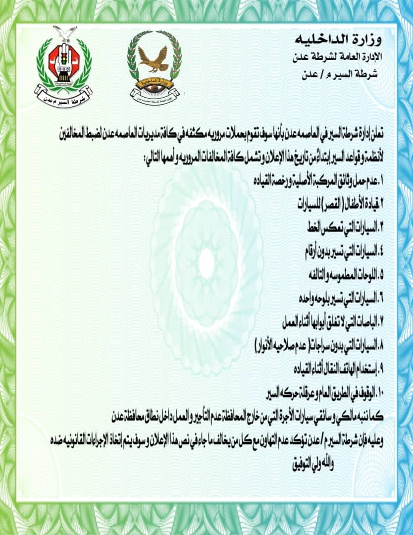 أعلنت إدارة شرطة السير في العاصمة عدن، اليوم، عن بدء حملة مرورية مكثفة تشمل كافة مديريات العاصمة، تهدف إلى ضبط المخالفين لأنظمة وقواعد السير، وذلك ابتداءً من تاريخ صدور هذا الإعلان.