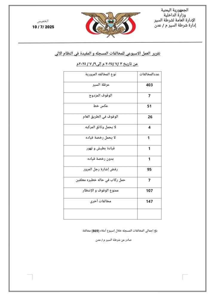 أعلنت إدارة شرطة السير بالعاصمة عدن، عن تسجيل 869 مخالفة مرورية خلال أسبوع واحد، وذلك للفترة الممتدة من 3 يوليو 2025 وحتى 9 يوليو 2025م، وذلك ضمن جهودها المتواصلة لتنظيم الحركة المرورية والحد من المخالفات التي تهدد السلامة العامة.