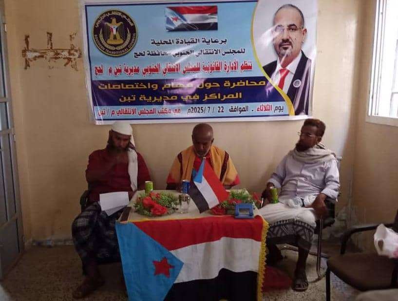 نظم القسم القانوني بالهيئة التنفيذية للقيادة المحلية للمجلس الانتقالي الجنوبي في مديرية تبن بمحافظة لحج، اليوم الثلاثاء، محاضرة عن مهام واختصاصات المراكز المحلية في المديرية.