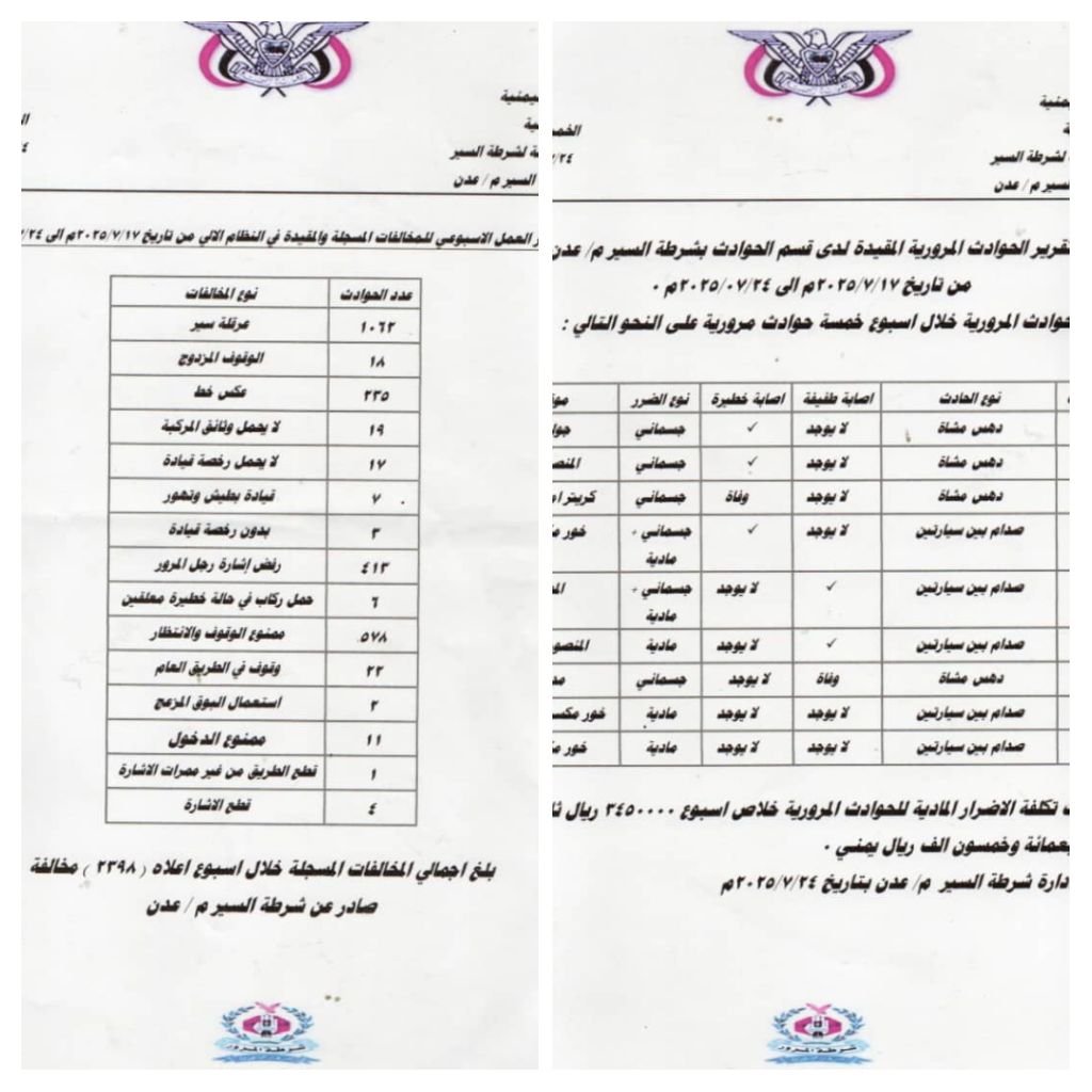 أعلنت إدارة شرطة السير في العاصمة المؤقتة عدن عن الإحصائية الأسبوعية للمخالفات والحوادث المرورية المسجلة خلال الفترة من 17 يوليو وحتى 24 يوليو 2025م، والتي كشفت عن حجم التحديات التي تواجه حركة السير والانضباط المروري في المدينة.