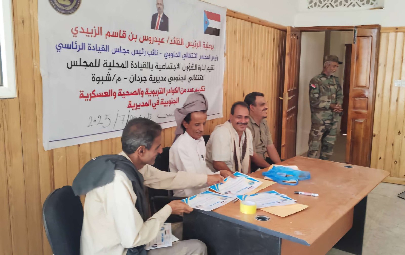 نظم قسم الشؤون الاجتماعية بالهيئة التنفيذية للقيادة المحلية للمجلس الانتقالي الجنوبي في مديرية جردان بمحافظة شبوة، اليوم الثلاثاء، حفلاً تكريميًا لعددٍ من الكوادر التربوية والصحية والأمنية والمهنية في المديرية، تقديرًا لجهودهم التي بذلوها في خدمة المجتمع.