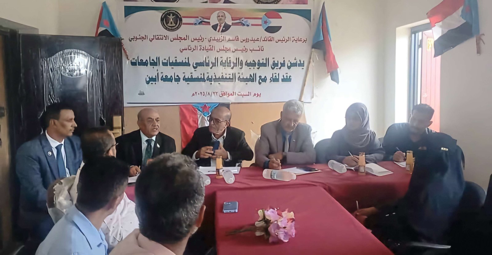 عقد فريق التوجيه والرقابة الرئاسية، برئاسة عضو هيئة رئاسة المجلس الانتقالي الجنوبي، الدكتور عيدروس اليهري، اليوم السبت، لقاءً بالهيئة التنفيذية لمنسقية المجلس الانتقالي الجنوبي في جامعة أبين.