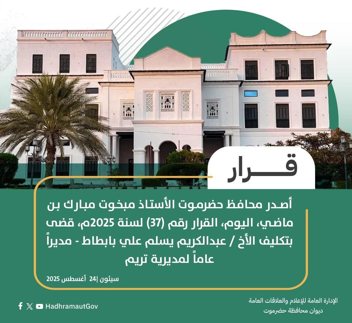أصدر محافظ حضرموت، الأستاذ مبخوت مبارك بن ماضي، اليوم الأحد 24 أغسطس 2025، القرار رقم (37) لسنة 2025م، بتكليف عبدالكريم يسلم علي بابطاط مديرًا عامًا لمديرية تريم.