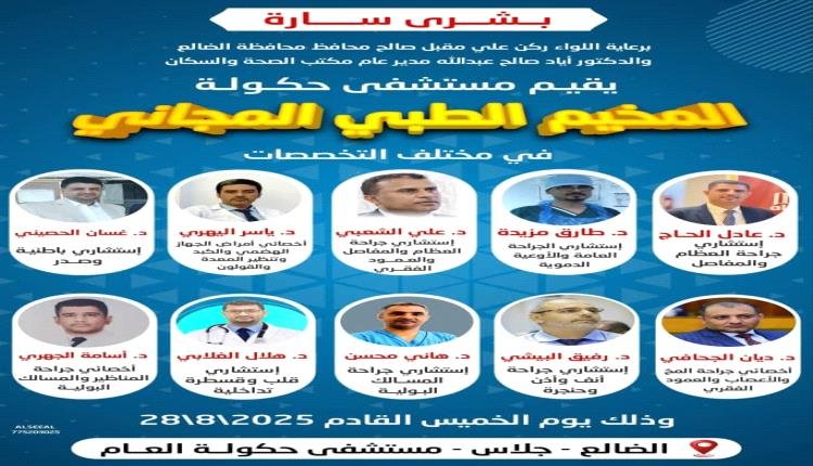 برعاية محافظ محافظة الضالع اللواء الركن علي مقبل صالح وباشراف مكتب الصحه العامه والسكان مستشفى الضالع المركزي حكوله يقيم مخيم طبي مجاني ويستضيف نخبه من الاستشاريين في مختلف التخصصات يوم الخميس القادم 28/8/2025