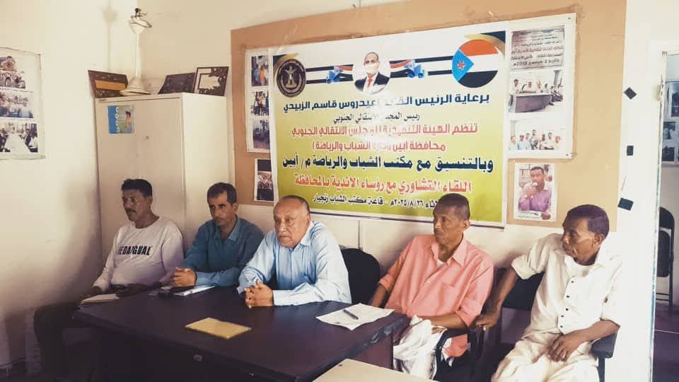 نظمت إدارة الشباب والرياضة بالهيئة التنفيذية للقيادة المحلية للمجلس الانتقالي الجنوبي بمحافظة أبين، اليوم الثلاثاء، في مدينة زنجبار، لقاءً تشاورياً مع رؤساء الأندية الرياضية بالمحافظة، وذلك بالتنسيق مع مكتب الشباب والرياضة بالمحافظة.