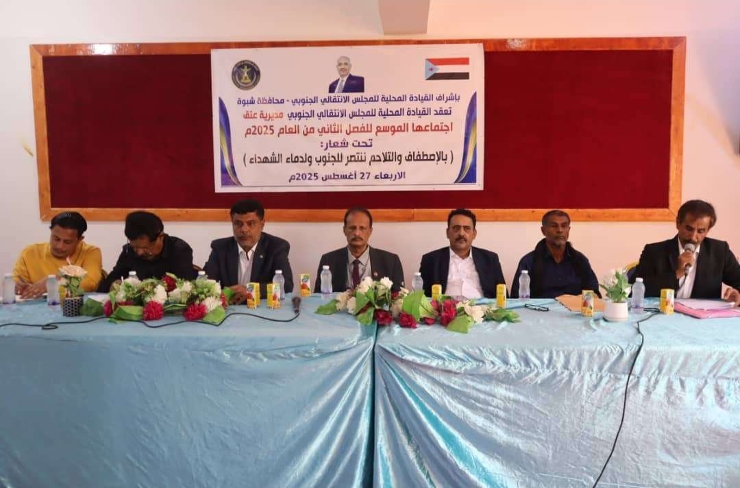 عقدت القيادة المحلية للمجلس الانتقالي الجنوبي بمديرية عتق، بمحافظة شبوة، اليوم الاربعاء، اجتماعها الموسع للفصل الثاني من العام الجاري، برئاسة الدكتور سالم علي القميري عضو هيئة رئاسة المجلس الانتقالي الجنوبي، رئيس فريق التوجيه والرقابة الرئاسي بالمحافظة.