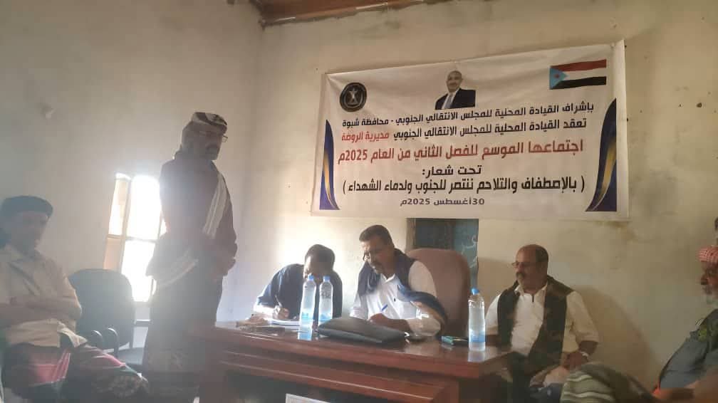 عقدت القيادة المحلية للمجلس الانتقالي الجنوبي في مديرية الروضة، بمحافظة شبوة، اليوم السبت، اجتماعها الموسع للفصل الثاني من العام الجاري، برئاسة الأستاذ توفيق عبدالله المسب، رئيس الهيئة.