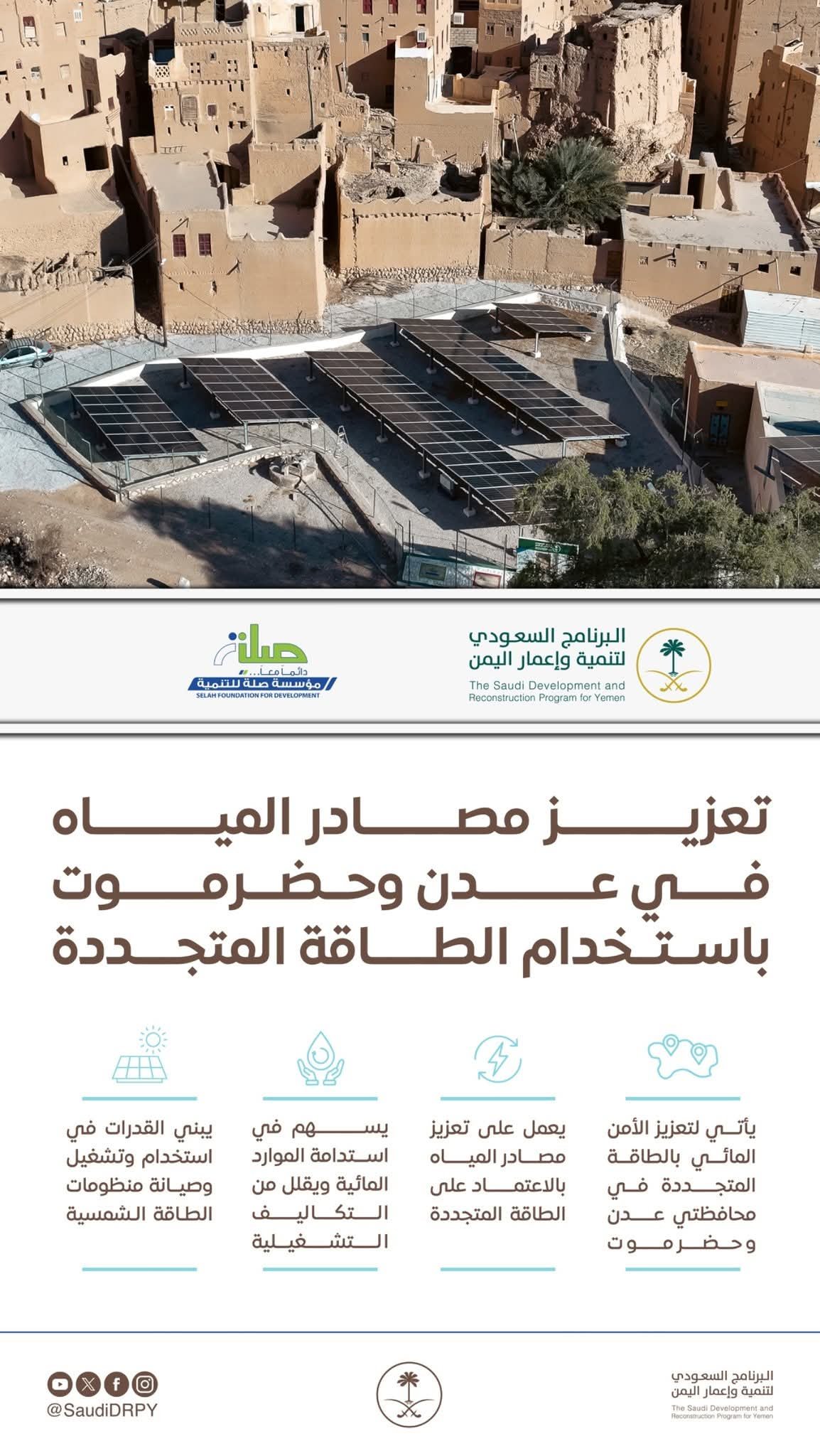 وتهدف هذه المشاريع إلى ضمان استدامة الموارد المائية، وتعزيز قدرة المجتمعات المحلية على تشغيل وصيانة منظومات الطاقة الشمسية ، بما يساهم في تحسين الخدمات الأساسية وتحقيق أهداف SDGs في اليمن.