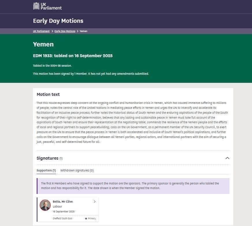 اصدر البرلمان البريطاني في يومنا هذا رسمياً مذكرة قرار دعم للقضية الجنوبية وسيتم مناقشة ذالك في المستقبل القريب .