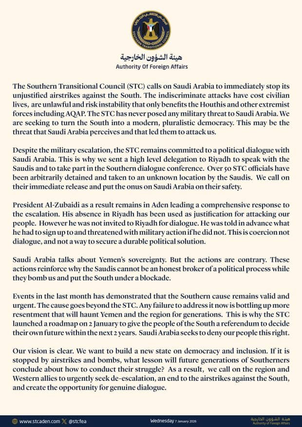 يدعو المجلس الانتقالي الجنوبي، المملكة العربية السعودية إلى الوقف الفوري لغاراتها الجوية غير المبررة على الجنوب، لقد أودت هذه الهجمات العشوائية بحياة مدنيين، وهي غير قانونية وتُعرّض الاستقرار للخطر، ولا يستفيد منها سوى الحوثيين وقوى متطرفة أخرى بما في ذلك تنظيم القاعدة في جزيرة العرب.