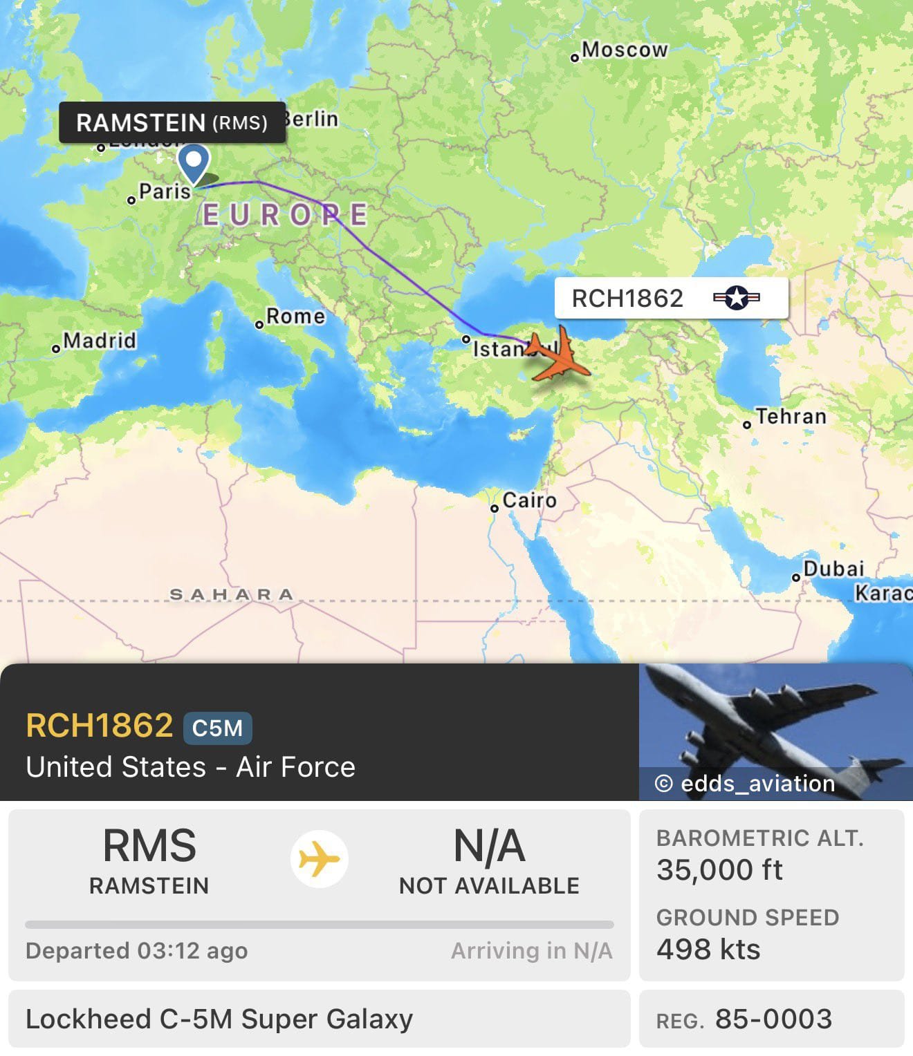 تتجه طائرة النقل الإستراتيجي الثقيلة من طراز C-5M “سوبر غلاكسي” التابعة لسلاح الجو الأمريكي نحو الجنوب الشرقي عبر الأجواء التركية، في طريقها إلى الشرق الأوسط، وذلك بعد إقلاعها في وقت سابق من يوم السبت من قاعدة رامشتاين الجوية في ألمانيا.