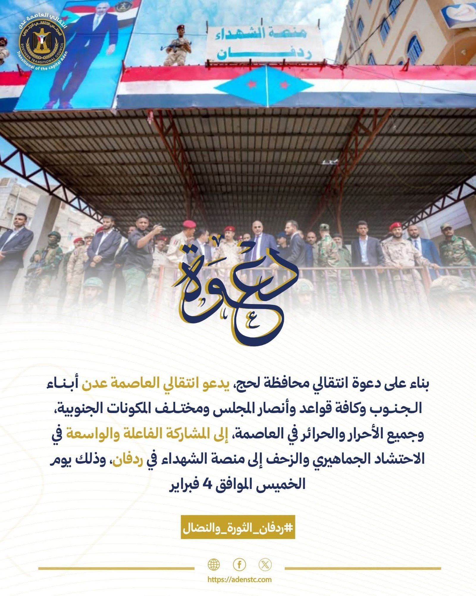 وتأتي تلبية انتقالي العاصمة عدن لهذه الدعوة كخطوة لتعزيز الاصطفاف الوطني خلف القيادة السياسية، وتأكيداً على أن عدن وردفان ولحج وكل محافظات الجنوب تقف في خندق واحد لمواجهة كافة التحديات والمؤامرات التي تستهدف قضية الشعب وتطلعاته المشروعة.