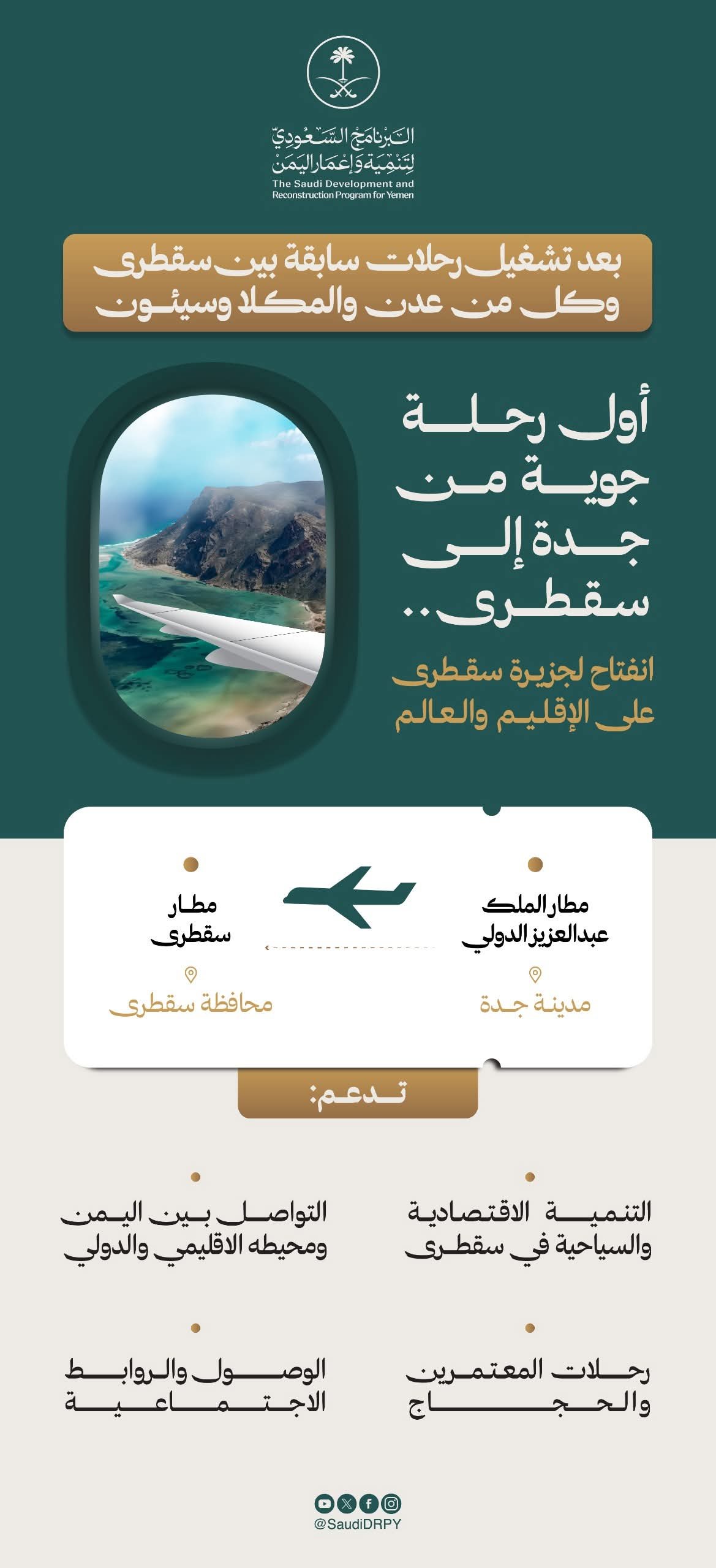 ويأتي تشغيل الخط الجوي المباشر بين مطار الملك عبدالعزيز الدولي بجدة ومطار سقطرى ضمن جهود البرنامج السعودي لتنمية وإعمار اليمن لتعزيز الربط الجوي ورفع كفاءة البنية التحتية لقطاع الطيران، بما يسهم في تحسين خدمات النقل الجوي.