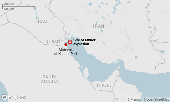 ذكرت هيئة عمليات التجارة البحرية البريطانية، مساء الاربعاء، انها تلقت بلاغا من قبطان ناقلة كانت راسية على بُعد نحو 30 ميلاً بحرياً جنوب شرقي الكويت يفيد شاهد وسمع انفجاراً كبيراً عند جانب الميناء، أي الجهة اليسرى من السفينة، قبل أن يلاحظ زورقاً صغيراً يغادر المنطقة.